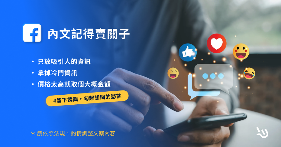 一旦你把池子养起来,以后只要有新商品,就可以第一时间丢给这群有购买意愿的目标客户。要成功捕鱼,少不了一篇成功的帖文作为诱饵,故行销快手整理了房仲、车仲或行销人必知的文案撰写方法,以下方法将以房仲为例。
